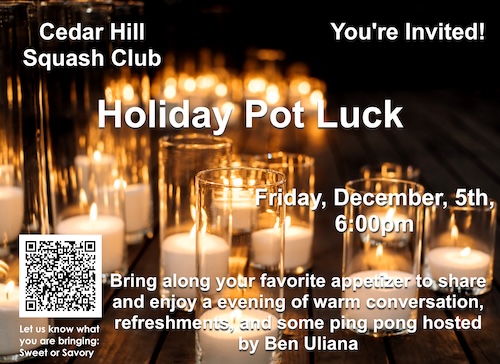Save the date! Members of the Cedar Hill Squash Club come and have a tasty beverage, share our favorite holiday dish and sit by a fire!